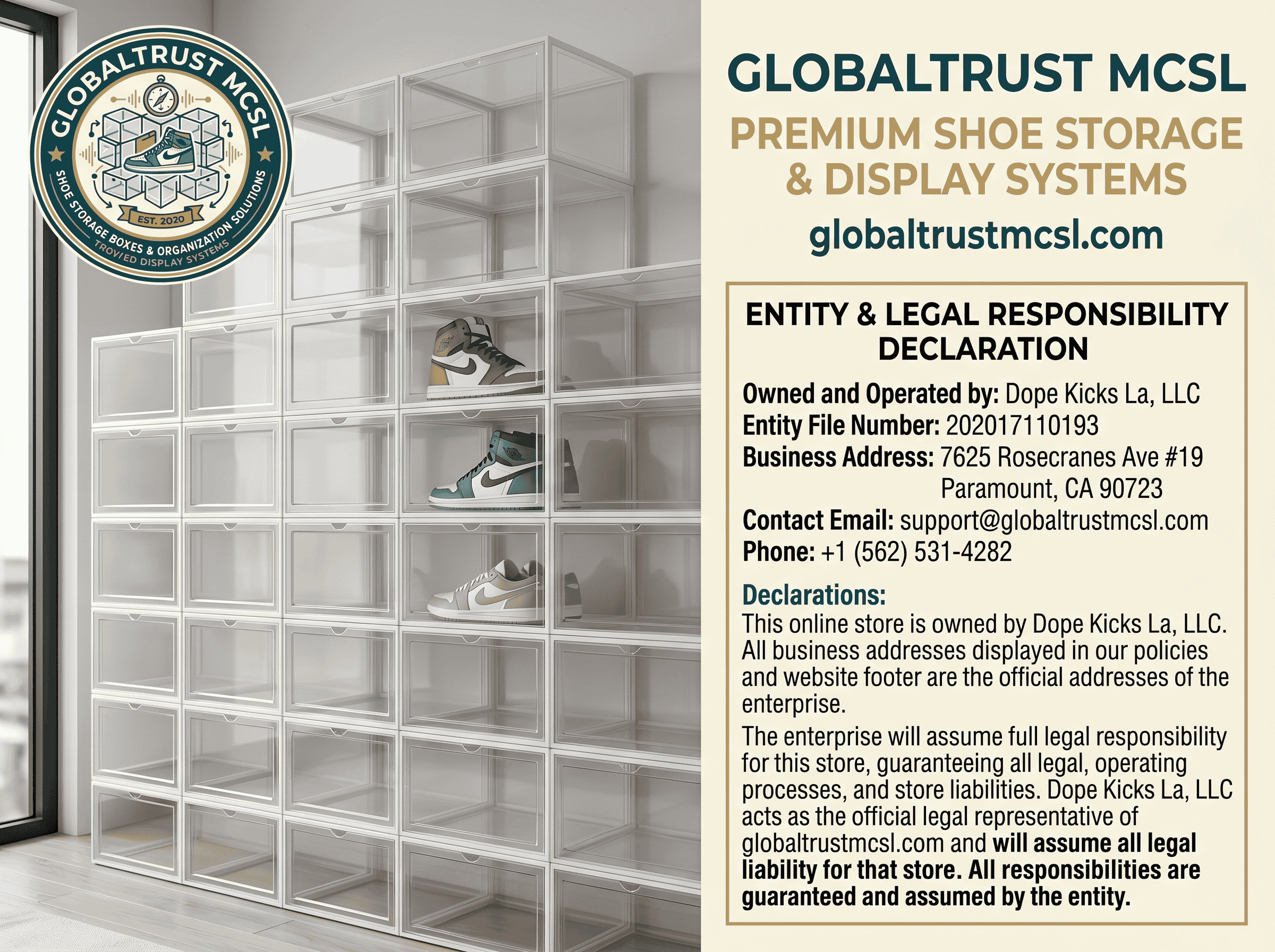 Based in Paramount, California and serving sneaker enthusiasts across the United States, GlobalTrust MCSL is operated by Dope Kicks La, LLC with one simple goal: to bring affordable, practical, and visually satisfying storage to every collector, renter, and home organizer who refuses to let their shoes live in chaos. We sell the boxes — you supply the heat. Together, we make your collection look exactly as good as it should.